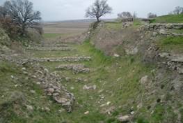 第二層還包括最早的城門、城牆、主殿,它的時間約在西元前2500年。城牆是紅磚,曾被火災燒過。主殿因腐蝕,一個小洞,一個小洞,有點相似蜂窩,現在外邊有帳篷保護著。我們的導遊,在這裡甚為詳細的解說,他說這裡是最早的特洛伊城牆與宮殿,佔地只100公尺長,100公尺寬,那麼小的王國。我們在這裡也流連甚久,想著王國的面積,也沒比我們家大多少。但想著它的歷史,比夏商周的歷史還早,真的叫人震撼。我們端詳著它,想著古人就有城牆,自我保護的觀念,又想著如何把磚塊,層疊起來。它不是神話傳說呢!它真實的擺在你眼前!