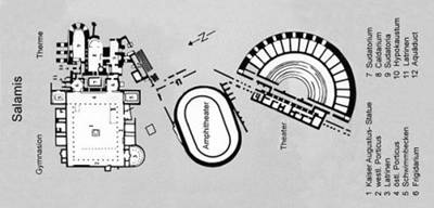 Adorno的父親Kinyras,他的塞浦路斯王宮在哪裡呢?荷馬說就在薩拉米salamis,就在我們現在站立的薩拉米古城廢墟。salamis在塞浦路斯的東海岸,famaguta海灣,這海灣離karpaz很近(請看地圖)。Aphrodite與Adonis嬉戲karpaz,Adonis衝向野豬身亡,Aphrodite泣血秋牡丹,是膾炙人口的神話。Salamis在希臘神話中,原是自然女神Nymphae,她是海神波塞冬的妻子。波塞冬把薩拉米帶到famaguta海灣,成了宗保,人們也叫這個地方為薩拉米。
