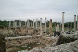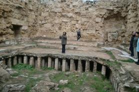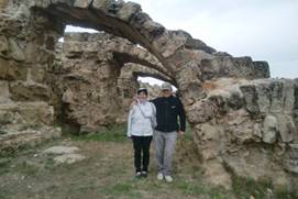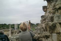 競技場上留著好多圓柱,還有好多石墩,石墩上面,原來是放羅馬皇帝雕像的,現在全都倒了。地上鋪陳的大理石,依然如故,還刻了一些我們看不懂的希臘字。競技場面積,甚是寬廣。運動完後,就到隔壁的澡堂三分暖。我們看過許多羅馬人建的澡堂,但薩拉米的澡堂,卻保持得相當的完整。通水的設備、熱水的設備,都極為完整。在那裡洗澡、在那裡聊天、在那裡休息、在那裡散步,梅琳都解釋的相當的詳細。我們還可以在拱門的圓頂上,看到希臘神話的圖案:希拉被自然女神誘惑的圖像。我們慢慢離開澡堂內部,從外邊看著它的雄偉結構。梅琳讓我們自由活動,我們到處照照像,我們也走到Famagusta海灣,想想當年薩拉米的繁華。這裡的遊客甚少,除了我們,只是零星的客人。我走到樹林底下,看著這一大片未被挖掘地古城。也想著自己真的那麼幸運,本來只想來塞浦路斯渡假,卻無意間發現那麼寶貴的歷史知識。最使我感到興奮的,我曾讀過好多希臘神話,這次塞浦路斯之遊,都一一現實的見證。我想到一句話:你一生執著什麼,上帝便會帶給你無意間的驚喜。